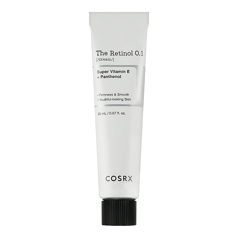 COSRX Krem Retinol 0,1 wygładza skórę i spowalnia procesy starzenia, zmniejszając głębokość drobnych zmarszczek powstałych na skutek przesuszenia. Idealny dla osób, które po raz pierwszy wprowadzają retinol do swojej pielęgnacji skóry: produkt jest bogaty w składniki odżywcze i nawilżające, które zapobiegają podrażnieniom powodowanym przez retinol. Wyrównuje koloryt i teksturę skóry, dodaje elastyczności i jędrności oraz delikatnie rozjaśnia ślady trądziku. Zmniejsza nadmierną produkcję sebum, zapobiega pojawianiu się tłustego połysku i zatykania porów. Zmniejsza ilość zaskórników. Głównym składnikiem formuły jest 0,1% czysty retinol. Pobudza odnowę komórkową, dzięki czemu wygładza zmarszczki, wyrównuje mikrorzeźbę i zmniejsza widoczność przebarwień.