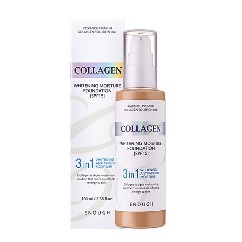 Collagen Whitening Moisture Foundation SPF15 (21) Podkład do twarzy TM ENOUGH Zapewnia równomierne, trwałe pokrycie, wyrównuje koloryt skóry, ukrywa jej niedoskonałości, nadaje jej efekt nawilżenia i blasku. Dzięki zawartości ekstraktów roślinnych, kolagenu i aktywnych składników pielęgnuje skórę przez cały dzień. Chroni przed promieniowaniem UV, zapobiega pojawianiu się zaczerwienień. Sposób użycia: niezbędną ilość produktu równomiernie rozprowadzić na skórze twarzy i szyi opuszkami palców lub gąbką. Wyłącznie do użytku zewnętrznego. Przechowywać w miejscu niedostępnym dla dzieci. W przypadku wystąpienia podrażnienia natychmiast przerwać stosowanie. Przechowywać w temperaturze od +5°C do +25°C. Producent: CNT DREAM, 60, Beakseokgongdan3-gil, Seobuk-gu, Cheonan-si, Chungcheongnam-do, Republika Korei. Termin ważności podany na opakowaniu.