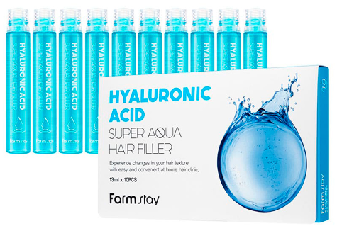 [FarmStay] Wypełniacz do włosów Super Aqua z kwasem hialuronowym Wypełniacz do włosów z kwasem hialuronowym Formuła na bazie kwasu hialuronowego nawilża i zagęszcza każdy włos, działa regenerująco, likwiduje wysuszenie włosów, sprawia, że ​​rozdwajanie się końcówek staje się mniej widoczne i zapobiega łamaniu. Nie obciąża i nie skleja włosów, ułatwia rozczesywanie i eliminuje puszenie.