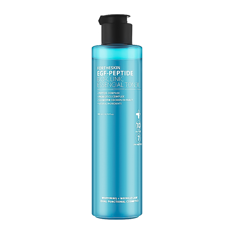 [FORTHESKIN] Przeciwstarzeniowy tonik do twarzy EGF-PEPTIDE BIO CLINIC ESSENCIAL TONER, 200 ml Lekki, niedrażniący tonik przeciwdziałający efektom starzenia. Delikatnie i delikatnie wchłania się w suchą skórę, pomagając pozostawić ją nawilżoną. Zawiera 10 rodzajów peptydów, 7 rodzajów probiotyków, ekstrakt z kokonu jedwabnika i 18 ekstraktów naturalnych. Kompleks składników przeciwstarzeniowych poprawia jędrność i elastyczność skóry.