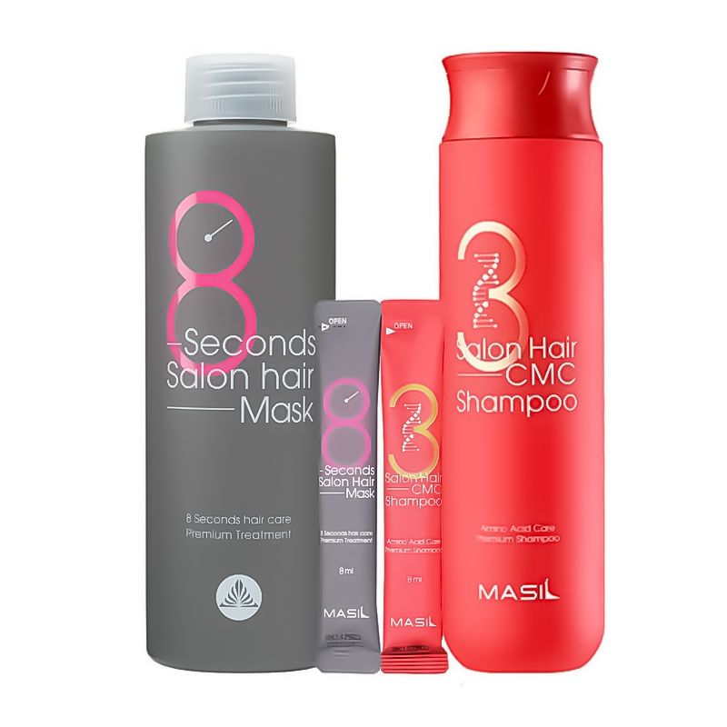 3 Salon Hair CMC Shampoo: Aqua, Ammonium Lauryl Sulfate, PEG-8, Ammonium Laureth Sulfate, Glycerin, Urea, Cocamidopropyl Betaine, Disodium Laureth Sulfosuccinate, Cocamide MEA, Propylene Glycol, Parfum, Sodium Benzoate, Betaine, Sodium Chloride, Guar ​Hydroxypropyltrimonium Chloride, Menthol, Salicylic Acid, Panthenol, Phenoxyethanol, Citric Acid, Butylene Glycol, Allantoin, Disodium EDTA, Hydrolyzed Collagen, Macadamia Ternifolia Seed Oil, Gelatin, Hydrogenated Lecithin, Hydrolyzed Keratin, Vitis Vinifera (Grape) Seed Oil, Avena Sativa (Oat) Kernel Extract, Glycine, 1,2-Hexanediol, Serine, Glutamic Acid, Hydrolyzed ​Com Protein, Hydrolyzed Soy Protein, Hydrolyzed Wheat Protein, Aspartic Acid, Leucine, Ceramide 3, Alanine, Lysine, Arginine, Tyrosine, Phenylalanine, Proline, Threonine, Valine, Isoleucine, Ceramide 1, Histidine, Cysteine, Methionine, Ceramide 2, Ceramide 4, Ceramide 6 (ll) 8 Seconds Salon Hair Mask: Propylene Glycol, Alcohol, Myristyl Alcohol, Aqua, Cyclopentasiloxane, Steartrimonium Chloride, Cetrimonium Chloride, Sodium Lactate, Behentrimonium Chloride, Parfum, Menthol, Salicylic Acid, Isopropyl Alcohol, Panthenol, Butylene Glycol, Glycerin, Hydrolyzed Keratin, Avena Sativa (Oat) Kernel Extract, Glycine, Spirulina Platensis Extract, Serine, Glutamic Acid, Hydrolyzed Corn Protein, Hydrolyzed Soy Protein, Hydrolyzed Wheat Protein, Phenoxyethanol, Aspartic Acid, Leucine, Alanine, Lysine, Arginine, Tyrosine, Phenylalanine, Proline, Threonine, Valine, Isoleucine, Histidine, Cysteine, Methionine, Acorus Calamus Root Extract, Calendula Officinalis Flower Extract, Camellia Sinensis Leaf Extract, Carum Petroselinum (Parsley) Extract, Centella Asiatica Extract, Citrus Limon (Lemon) Fruit Extract, Ginkgo Biloba Leaf Extract, Glycyrrhiza Glabra (Licorice) Root Extract, Houttuynia Cordata Extract, Lavandula Angustifolia (Lavender) Extract, Oryza Sativa (Rice) Bran Extract, Perilla Frutescens Leaf Extract, Salvia Officinalis (Sage) Leaf Extract, Actinidia Chinensis (Kiwi) Fruit Extract, Chrysanthemum Zawadskii Extract, Citrus Aurantium Dulcis (Orange) Fruit Extract
