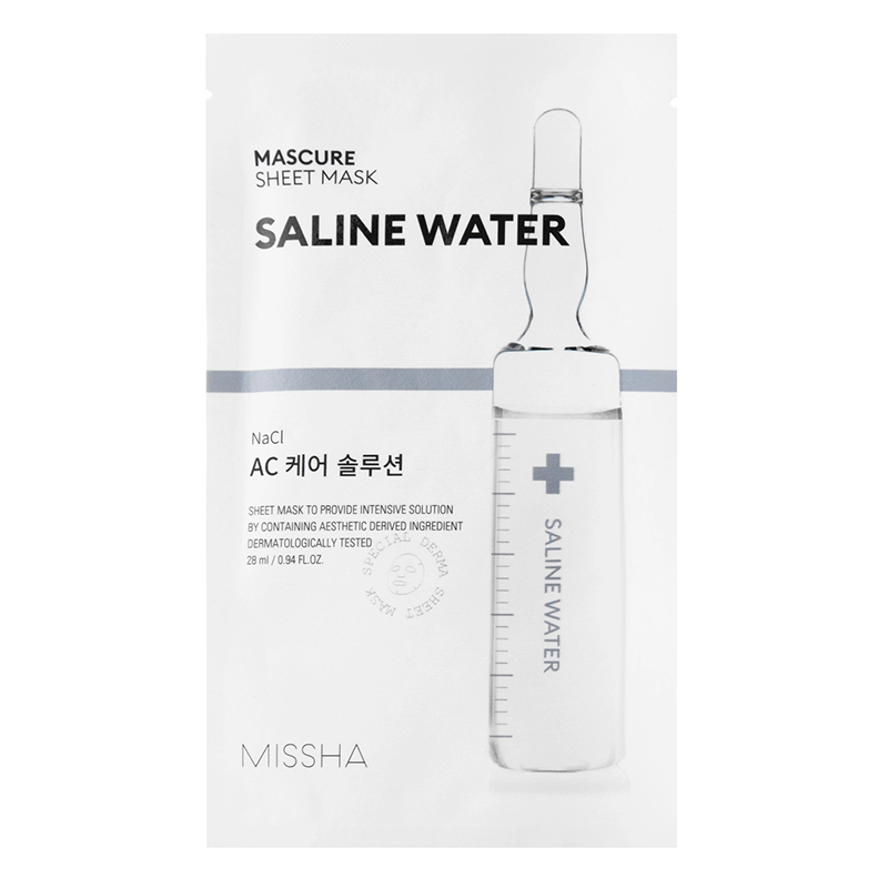 Missha - Mascure AC Care Solution Sheet Mask - Saline Water - maseczka w płachcie przeciwtrądzikowa. Zawiera olejek z drzewa herbacianego, który ma właściwości antyseptyczne i ściągające, pomagające zmniejszyć niedoskonałości skóry. Jest również wzbogacona słoną wodą, która odświeża i wspomaga gojenie. Skład maski obejmuje również liczne składniki nawilżające i łagodzące, w szczególności trehalozę i kwas hialuronowy. Ceramidy dbają o barierę ochronną skóry, a alantoina wspomaga regenerację. Maska łagodzi skórę i zmniejsza suchość.