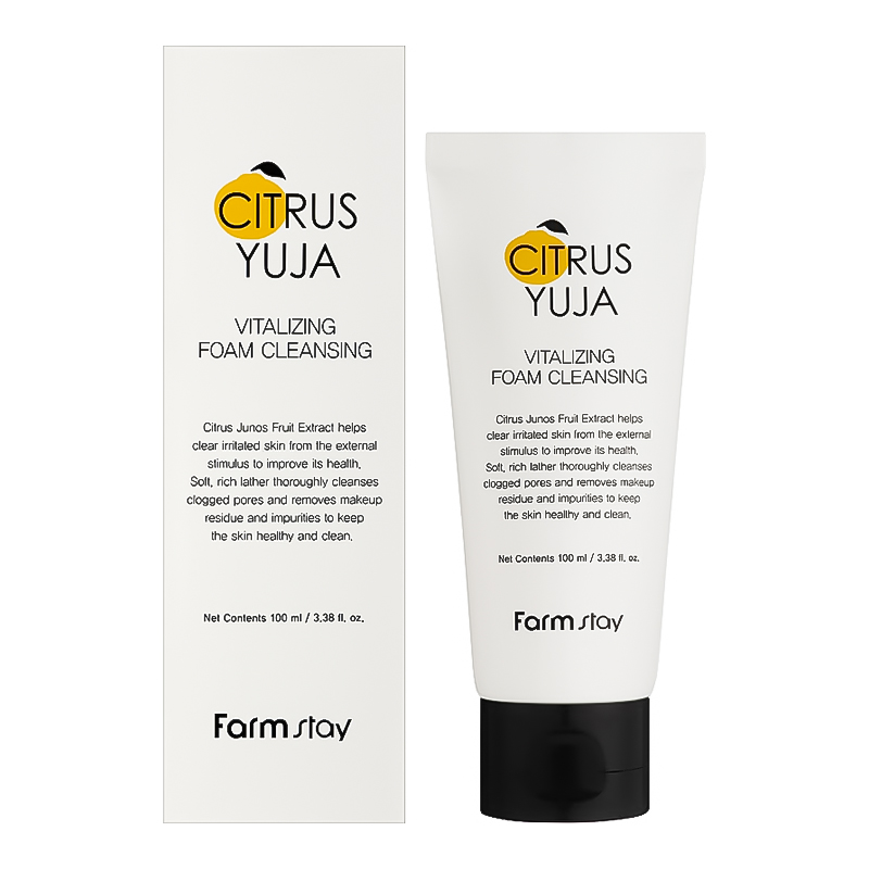 FARMSTAY Citrus Yuja Vitalizing Foam Cleansing Citrus Yuja Vitalizing Foam Cleansing Пінка для вмивання з екстрактом юдзу, 100 мл Освіжаюча очищувальна пінка для вмивання для шкіри обличчя, шиї та декольте ніжно очищає шкіру від забруднень, залишків макіяжу, шкірного жиру та ороговілих клітин, не пересушуючи і не стягуючи шкіру. Екстракт юдзу чинить потужну антиоксидантну дію, розгладжує зморшки, підтримує синтез колагену і підвищує пружність та еластичність шкіри. Пінка не залишає плівки на обличчі, дарує відчуття свіжості та чистоти. Для всіх типів шкіри.