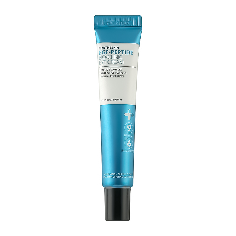 [FORTHESKIN] Крем для повік антивіковий EGF-PEPTIDE BIO-CLINIC EYE CREAM, 30 мл Це висококонцентрований омолоджувальний крем, який забезпечує інтенсивний догляд за ніжною шкірою навколо очей. Містить 10 видів пептидів, 7 видів пробіотиків, екстракт кокона тутового шовкопряда і 18 натуральних екстрактів. Синергія омолоджувальних інгредієнтів підвищує еластичність шкіри, зміцнює шкірний бар'єр і забезпечує пружність шкіри. За допомогою натуральних інгредієнтів надає шкірі життєвої сили. Поживна висококонцентрована текстура швидко поглинається шкірою, роблячи її гладкою.