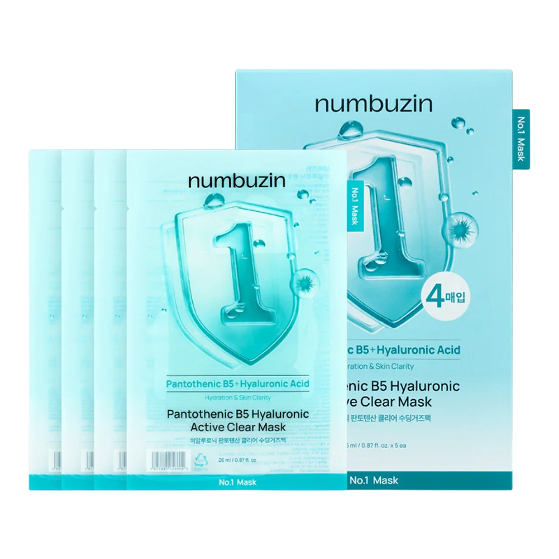 [NUMBUZIN] НАБІР тканинних масок для обличчя з пантенолом і гіалуроновою кислотою No.1 Pantothenic B5 Hyaluronic Active Clear Mask — 26 мл × 4 шт.